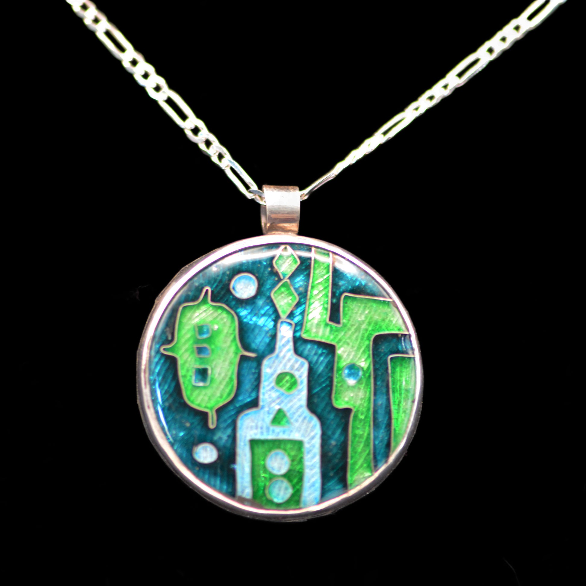 Cloisonne on fine silver foil over copper. Dimensions 1 ½" x 1 ¼", 18" chain.