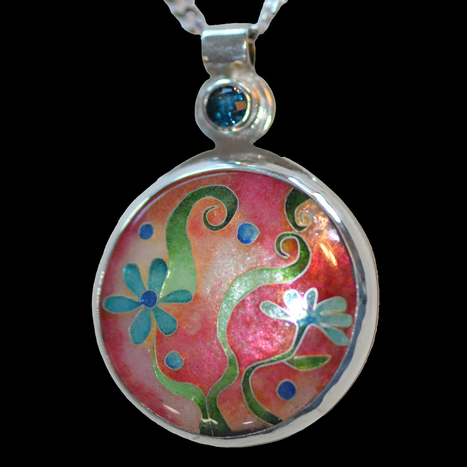 A bit of whimsy. Lovely blue flowers and swirling vibrant leaves with a reflective coral backdrop paint this piece. Set with London blue topaz.
