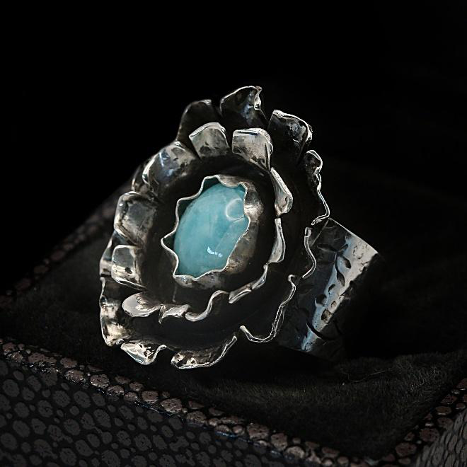 Tranquil blue amazonite stone set in a gorgeous repousse flower. Patterned daisy ring shank.