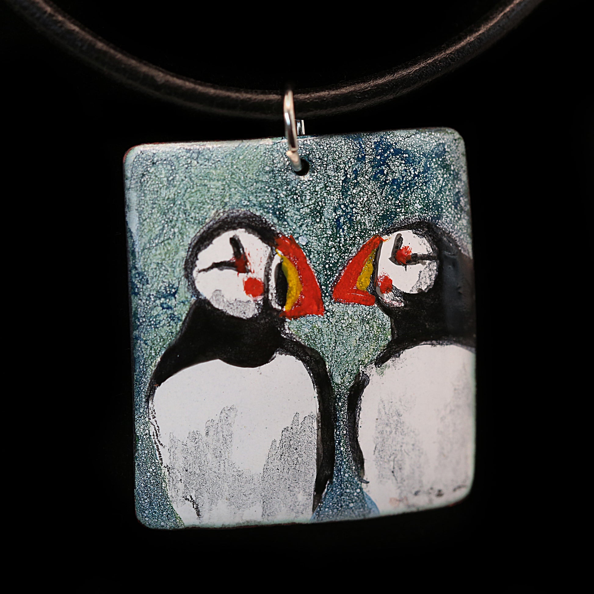 Adorable puffins seem to be having a talk in this enamel painting on copper pendant. Fun! Dimensions: 1 3/8" x 1 1/2", 18" leather cord necklace.