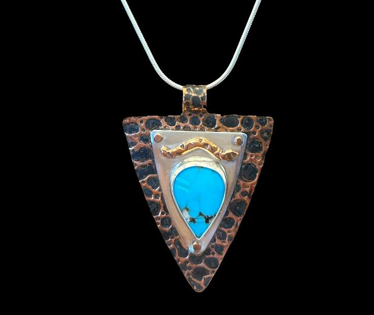 Stunning sleeping beauty turquoise with handmade snake set in patterned copper sealed with museum wax.