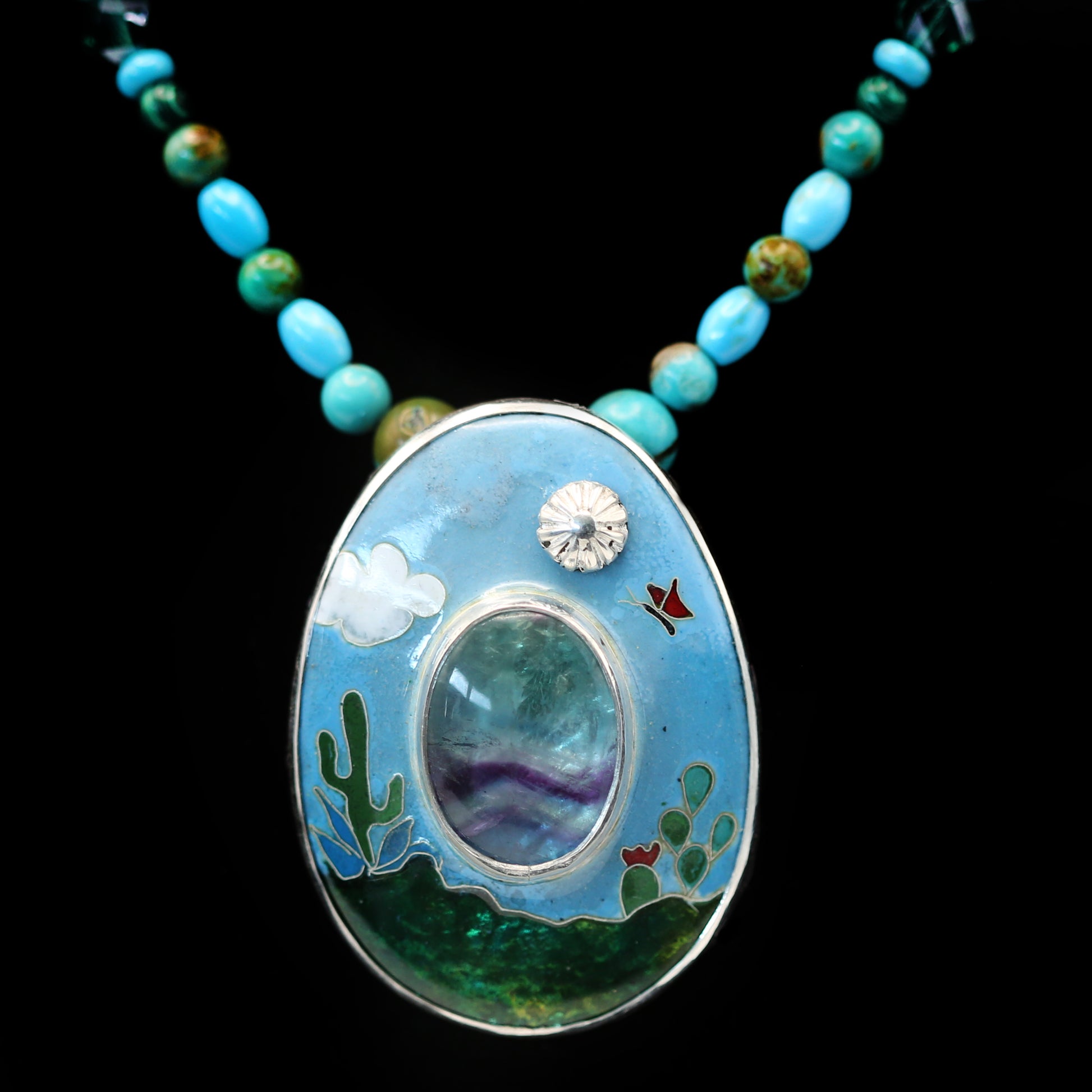 Inspired by the Sonoran Desert. The fluorite stone in this piece evokes images of the Arizona mountains. Turquoise, malachite and Swarovski beading add Southwest flair. Enamel over fine silver and copper. Fluorite, turquoise and malachite.