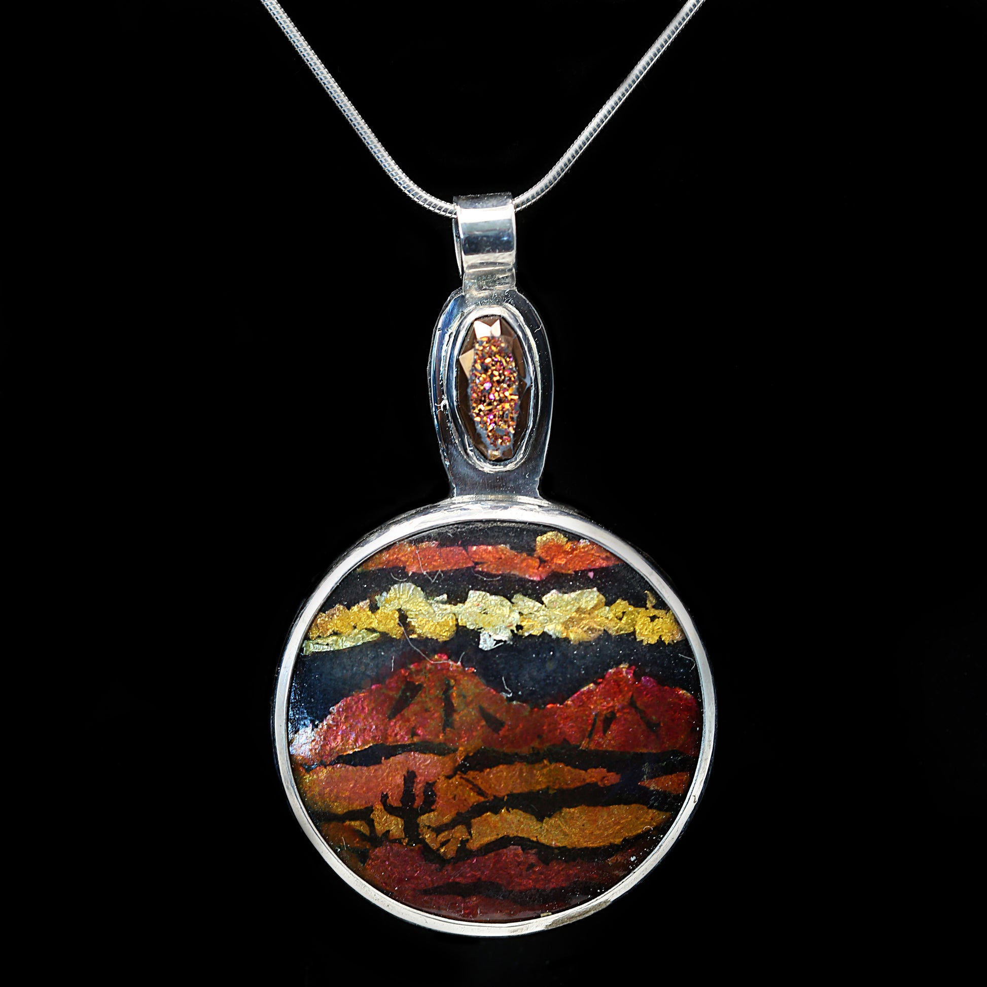 The clouds are set afire at sunset over the Catalina mountains. Set with a titanium drusy that is full of complementary sparkle.